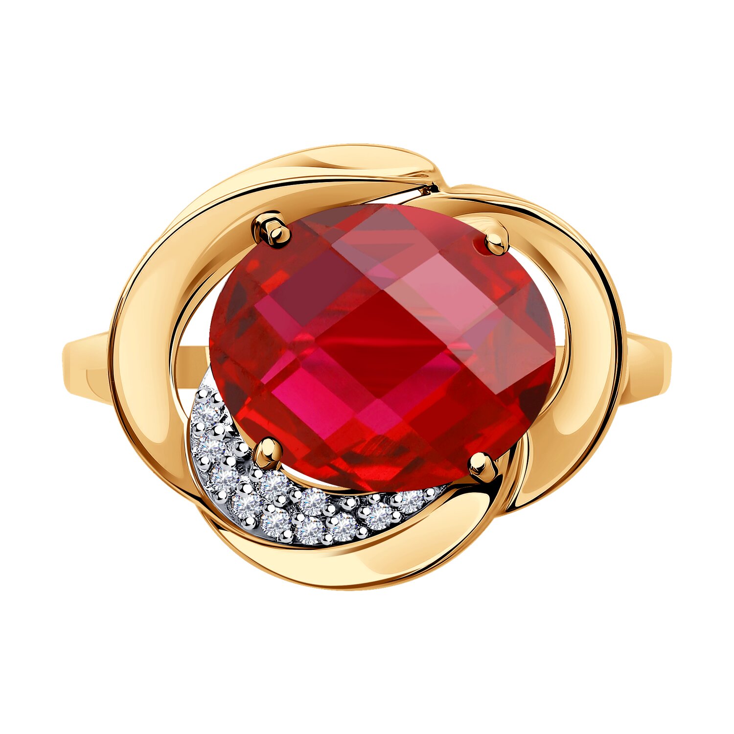 Кольцо из золота с красным корунд (синт.) и фианитами
